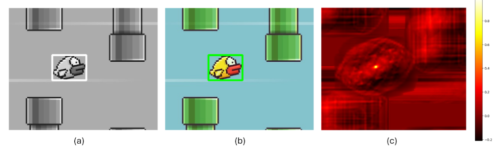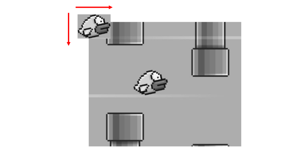 - A large (input) image (I) of a flappy-bird game screen.