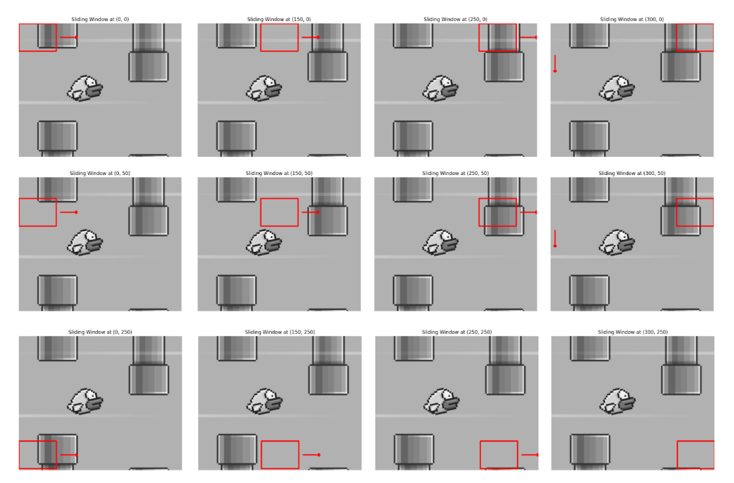 The images below illustrate how the sliding window technique operates by moving the template image (represented by the red rectangle) across the large image. Here the images are displayed at some intervals. The process begins by sliding the template from left to right, one pixel at a time.