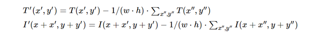 NCCOEFF is a further improvement on the correlation coefficient method. It normalizes the results, making it insensitive to both global intensity changes and contrast differences between the template and the image. It is mathematically expressed as: