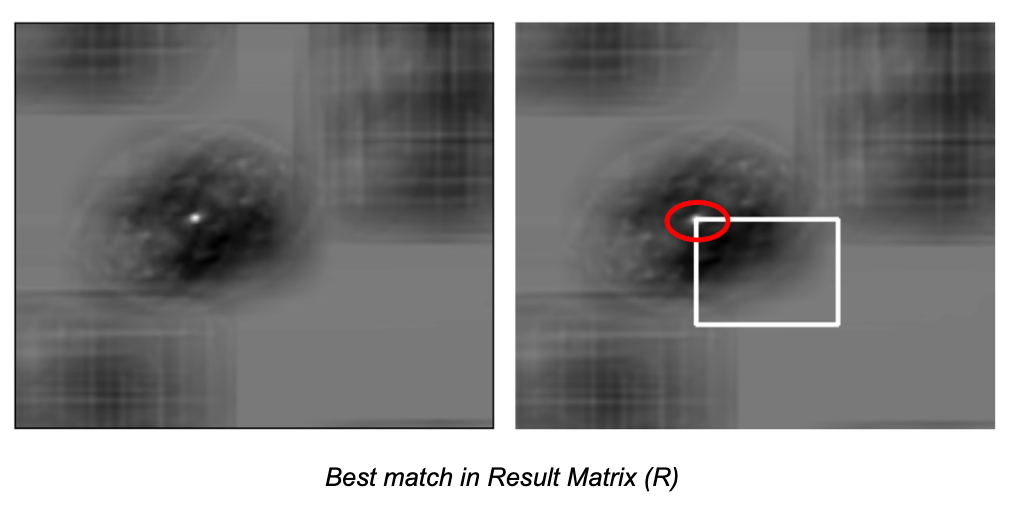 When you perform template matching using a method like cv2.TM_CCORR_NORMED (Normalized Cross-Correlation), the result is a new image where the brightest spots represent the best matches. For example, the location with the highest value (marked with a red circle in the image below) will be the top-left corner of a rectangle. This width and height of rectangle match the size of the template, showing where the best match is located in the larger image.