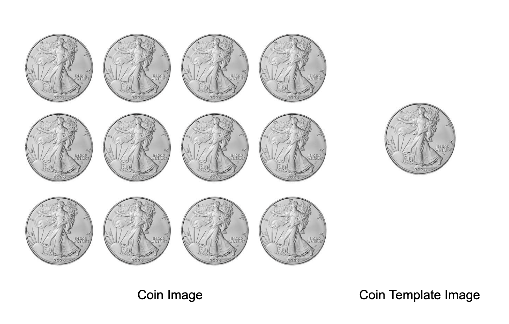 Consider the images below. The large image consists of multiple coins, and template image of coin to be searched.