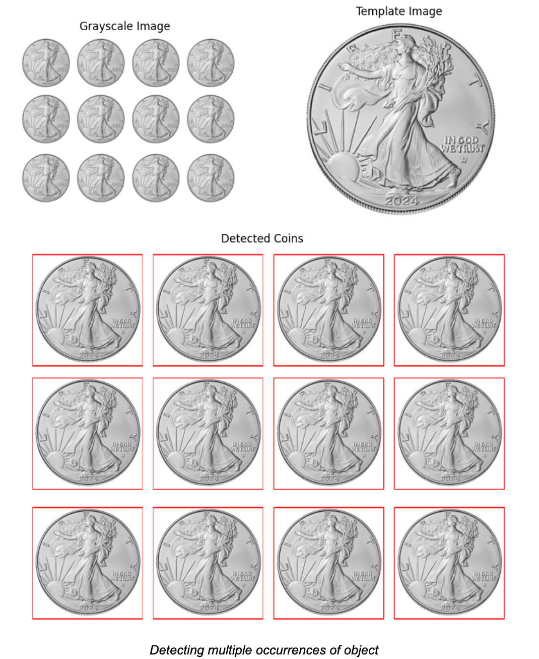 To handle multiple occurrences of an object, like finding all the coins in a large image, we can use thresholding. After matching the template with the image, we apply a threshold to detect all locations that have a high enough match. Then, we can draw rectangles around each matching object.