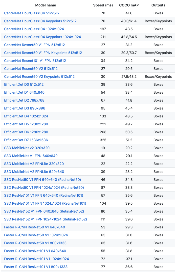 EfficientDet is an object detection model written by Google Brain, designed to trade of model size and inference time for performance on the COCO standard dataset. EfficientDet is a family of models scaling in size, all released in the TF 2 OD model zoo.