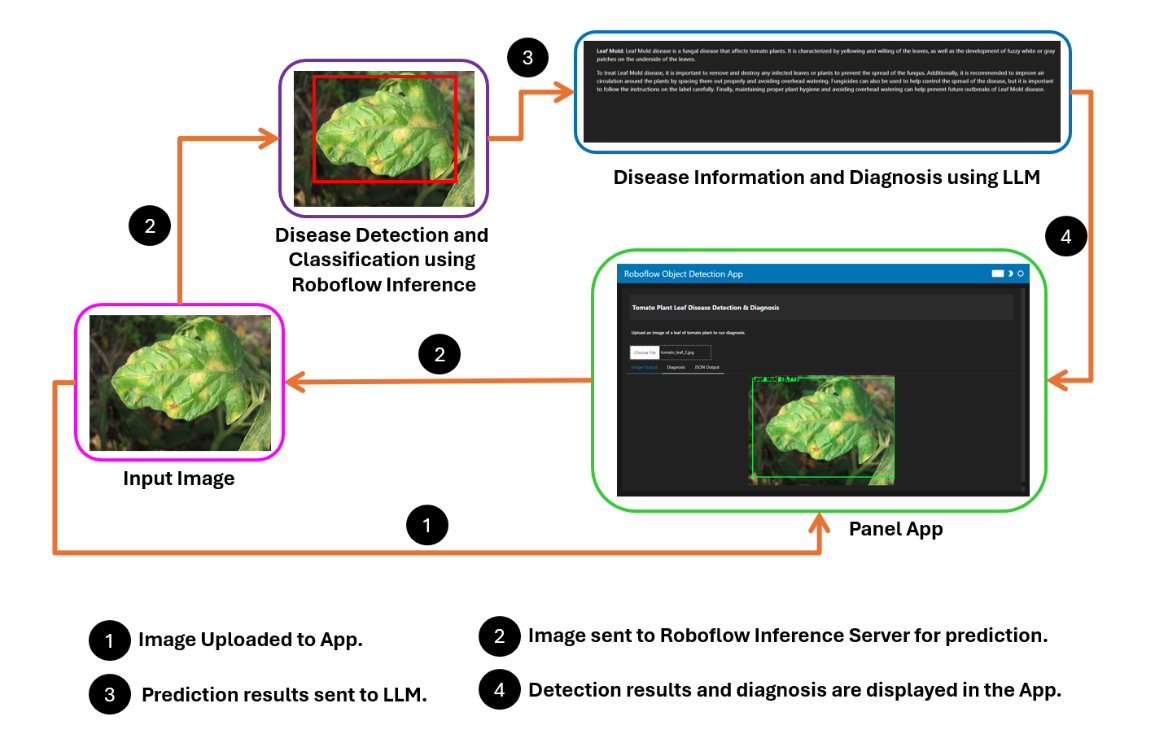 The user interface for our application is designed using the Panel Python library, providing an intuitive and interactive experience for users to upload images of tomato leaves and receive immediate diagnostic results with the help of LLM (i.e. GPT-3.5/GPT-4/GPT-4o). The application that we will develop, aims to assist farmers and agricultural professionals in monitoring and managing the health of their tomato crops efficiently.