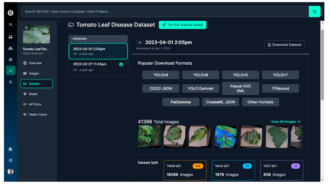 For our example in this blog post, we'll use the pretrained Tomato Leaf Disease Computer Vision model API from the Roboflow universe. The dataset for this project comprises over 20,000 images, which are divided into training, validation, and test sets as illustrated in the image below.