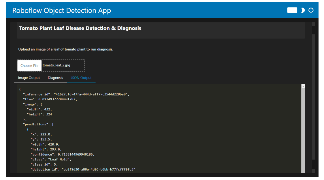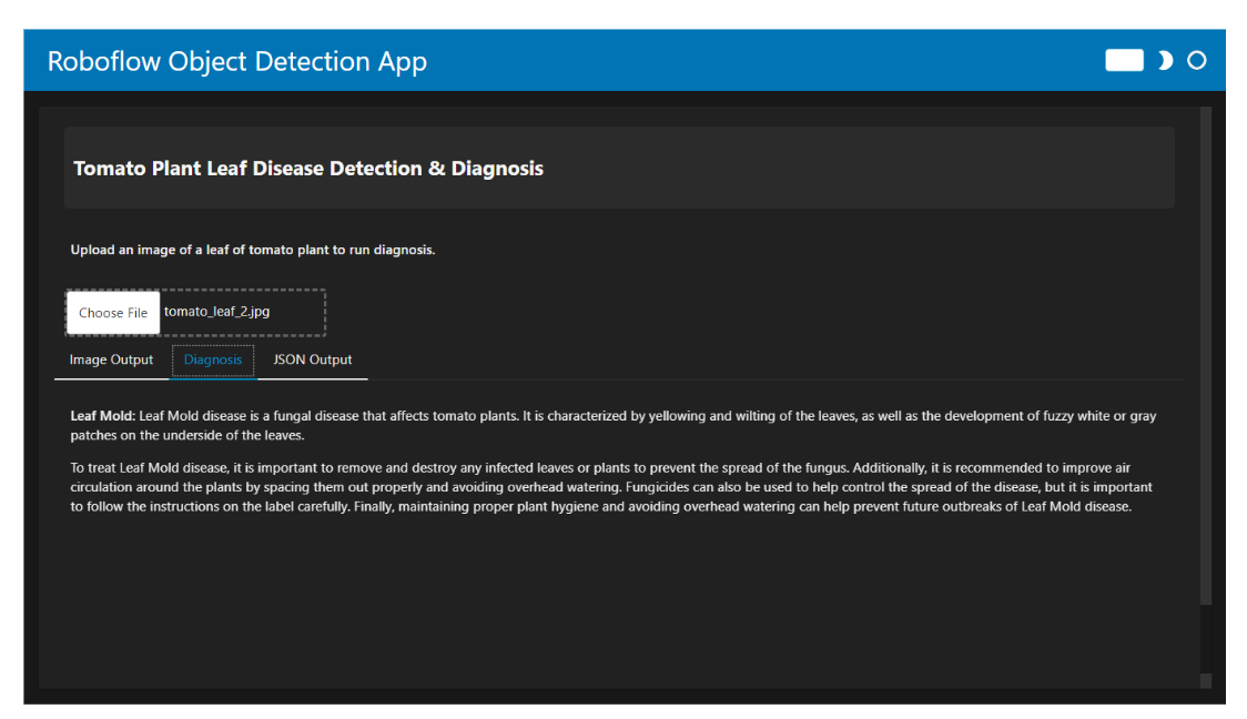 When you run the code, the app allows you to upload an image of a tomato plant leaf. The output is displayed in three different tabs: