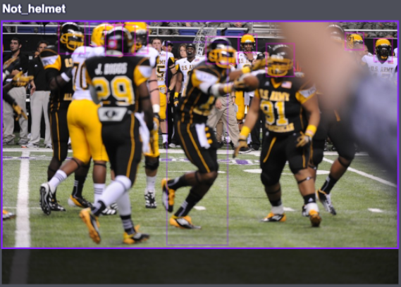 The helmet detection model is an object detection dataset with two classes that allows you to detect whether football players are wearing a helmet. The dataset contains 4.3K train, 416 valid, and 209 testing images with auto-orientation and resizing applied to each. This dataset can help detect helmets, track detected helmets, and identify impact to tracked helmets on the field.