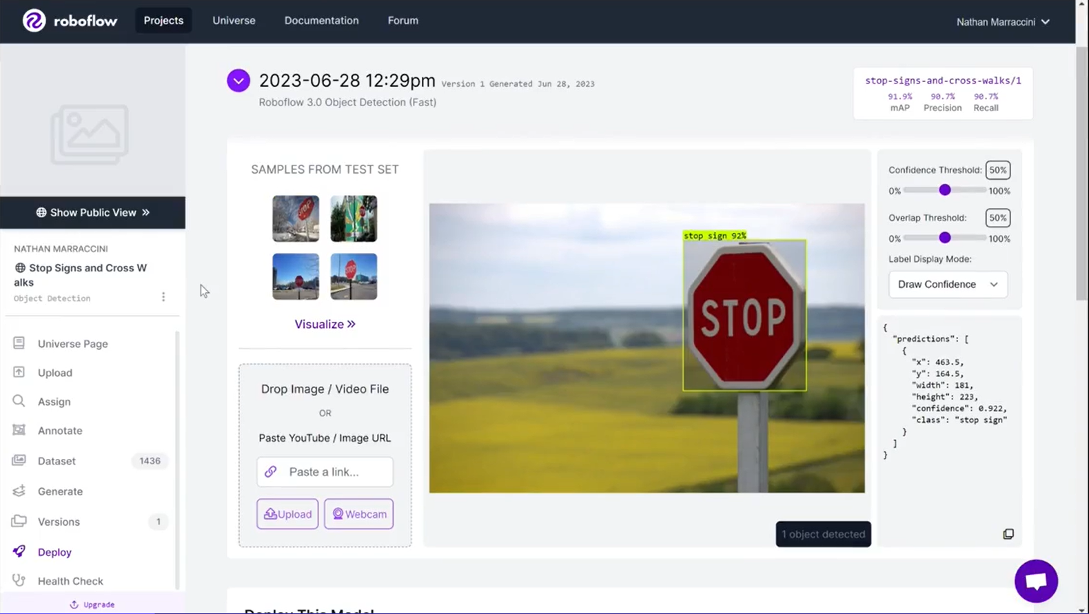 This opens a page where you can test your model using various media types, such as images, videos, or even your webcam. In the example below, a stop sign image is used, showcasing the model's ability to detect the sign with 92% confidence.