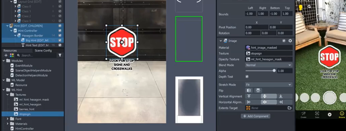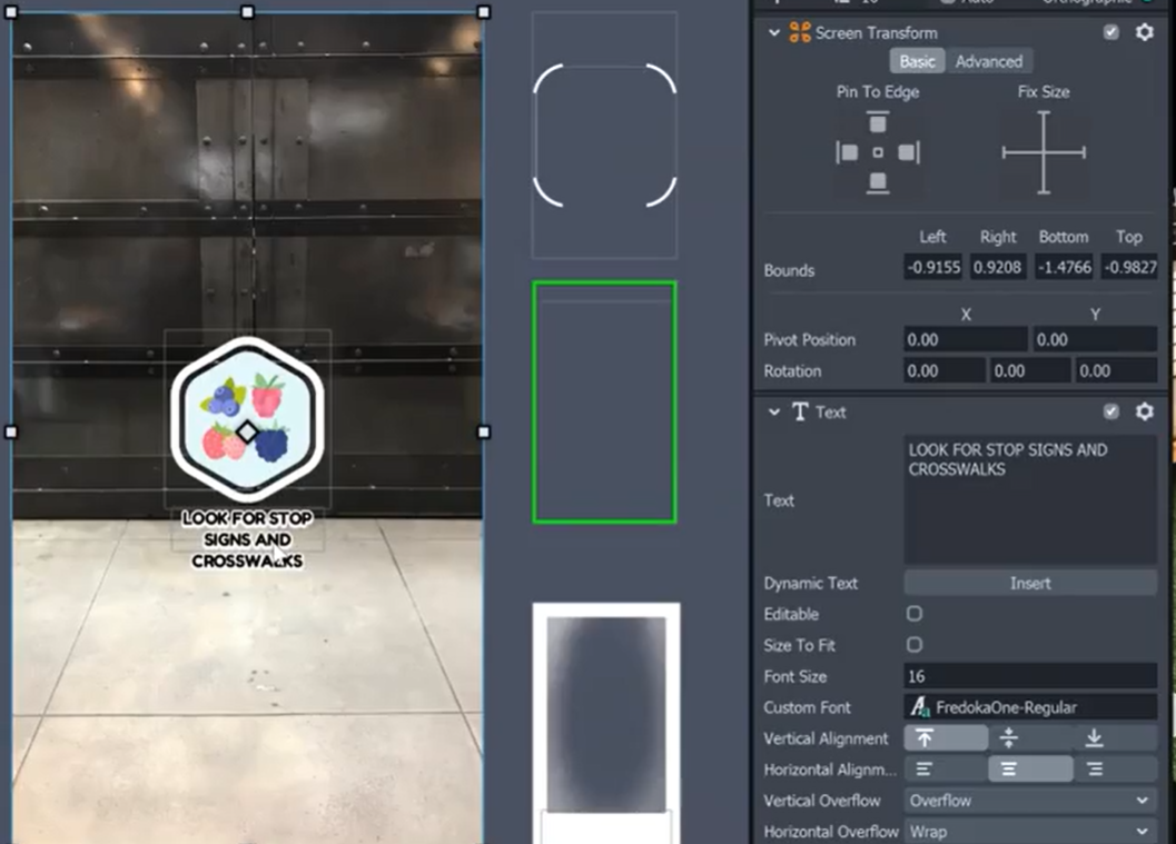 This will bring up the “Text” tab next to the preview window. This tab allows you to modify the text that users will see as a hint while using the lens. By default, the text will say "LOOK FOR BERRIES," but we want to tailor it to the specific purpose of detecting stop signs and crosswalks.