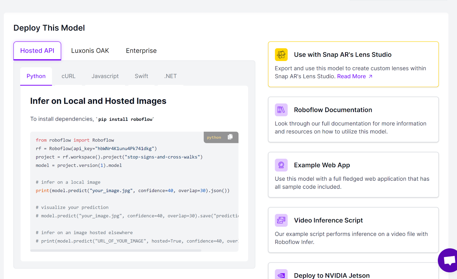 Roboflow offers the ability to deploy models as Snapchat lenses using Snapchat’s Lens Studio. This capability opens up exciting opportunities for creating interactive and engaging augmented reality experiences.