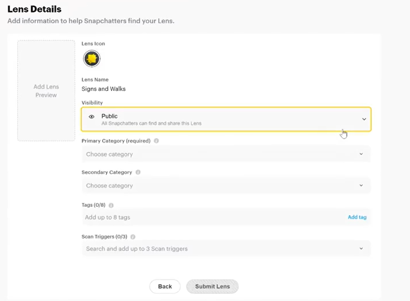The “Lens Details” page is important for providing information that helps Snapchatters find your lens. You can adjust the visibility, select categories, add relevant tags, and set up scan triggers for your lens. These details enhance the lens's discoverability and optimize its usage. Once you have completed the lens details, submit your lens for review.