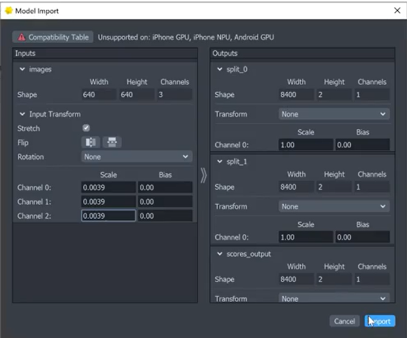 Adjust the weights of the “Scale” to 0.0039 for each channel and import the modified settings: