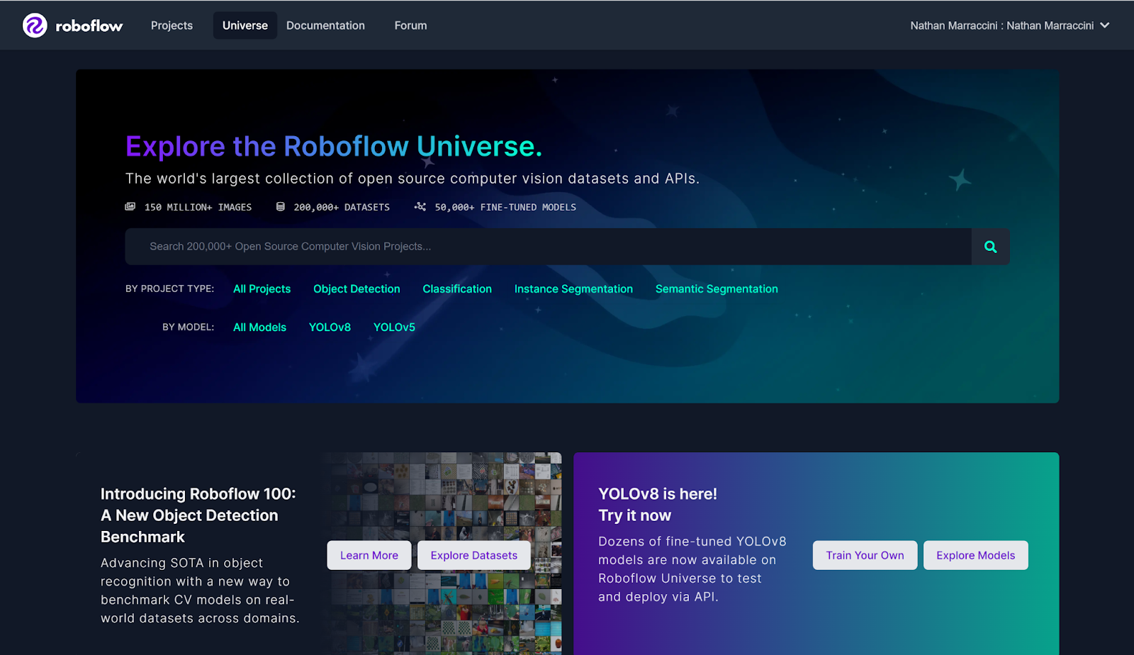 With Roboflow Universe, you gain access to a vast collection of resources for your computer vision projects. This includes nearly 150 million images, 200,000 datasets, and 50,000 fine-tuned models. The platform simplifies the process of gathering annotated images, making it easy to obtain the necessary data for training a wide range of models.
