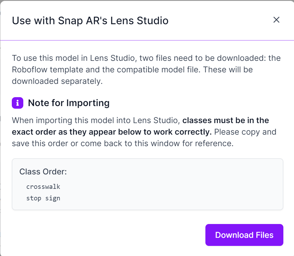 This brings you to a screen that displays instructions on what files will be downloaded and the order of classes used in your model. This order will be important in subsequent steps.