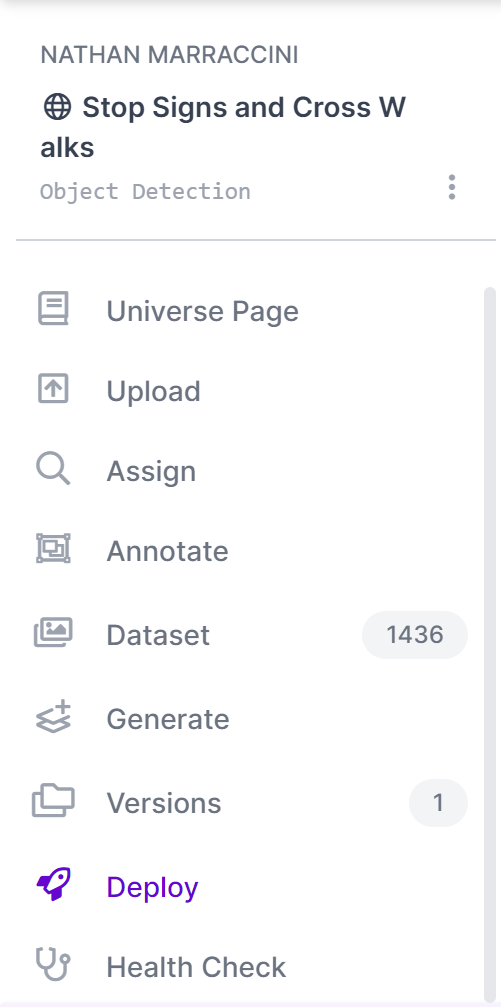 Navigate to your trained model on Roboflow's platform and click on the "Deploy" option that is located on the left side of your screen: