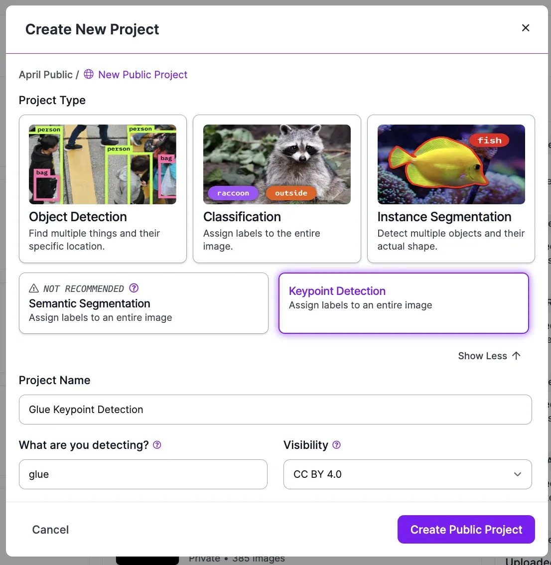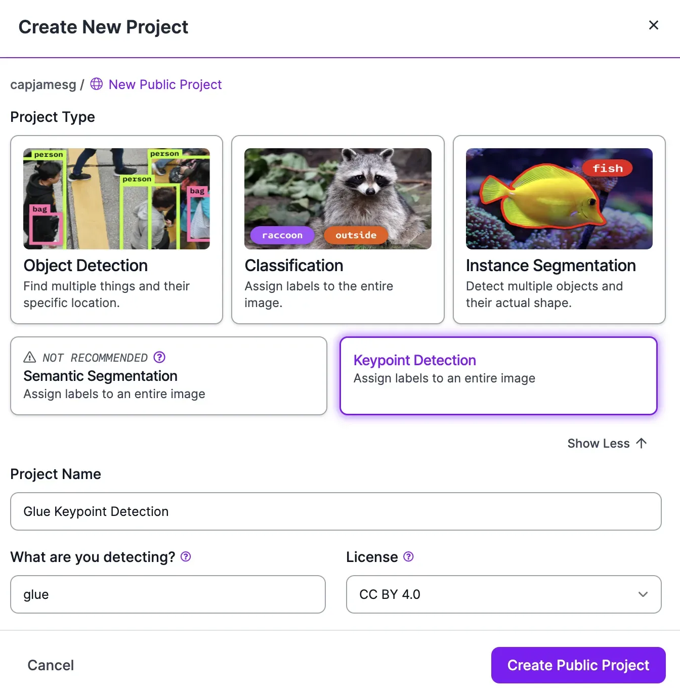 We want to create a keypoint detection model. To do so, click “See more” in the “Project type” section of the pop up and click “Keypoint detection”. Then, you can set a project name and choose a license for your project. You only need to set a license if the data associated with your project is public, which is the case for free plans whose data is available in Roboflow Universe.