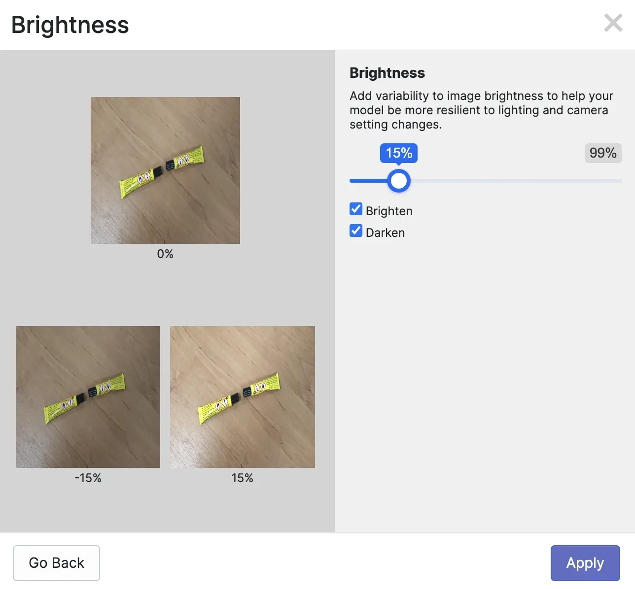 When you add augmentations, a preview will appear so you can see what an augmentation will look like on your dataset. Here is a preview of a brightness augmentation applied to our glue stick dataset: