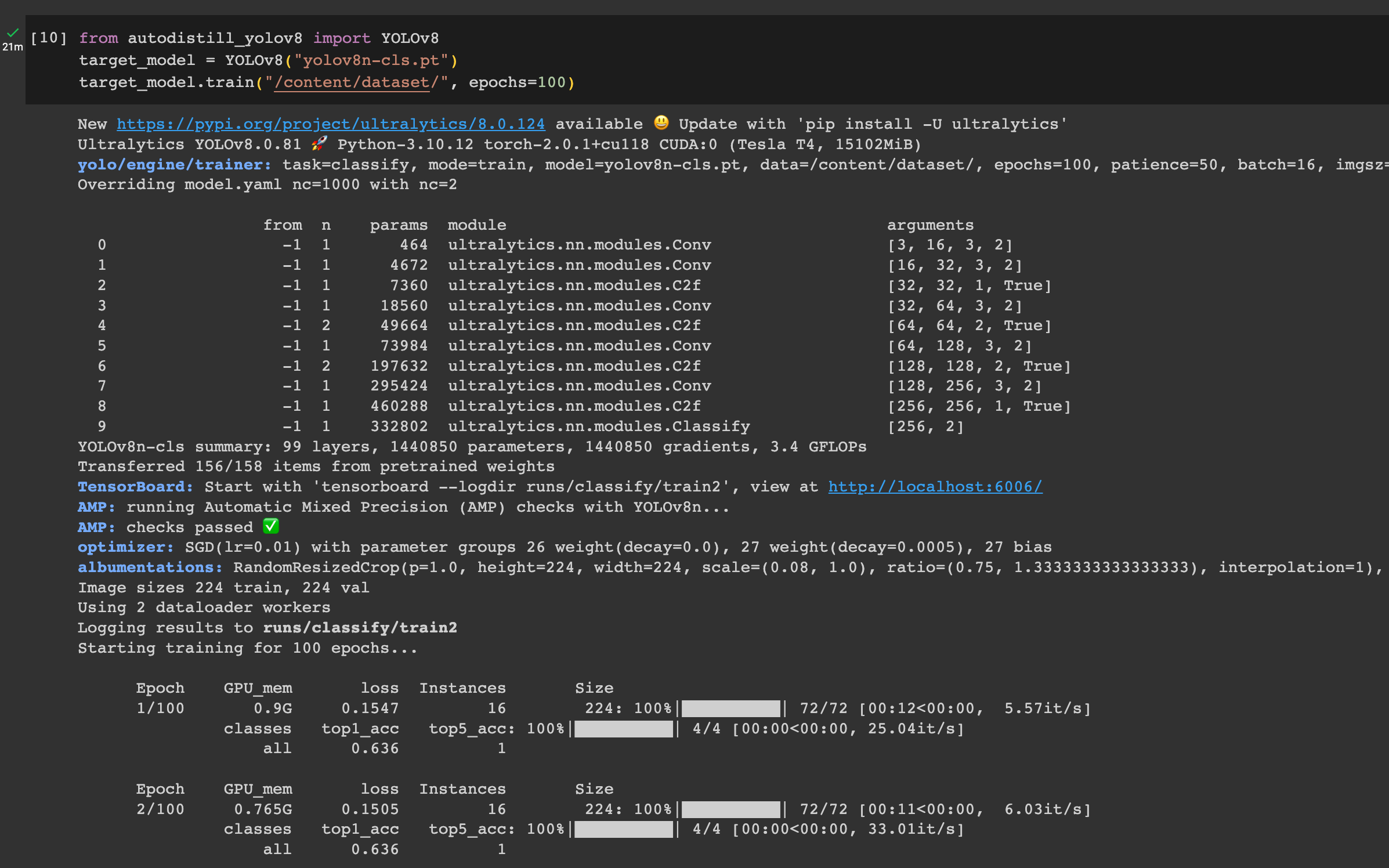 target_model.train("./dataset/data.yaml", epochs=100)These three lines of code are all we need to train our model. We will train our model over 100 epochs using the “n” YOLOv8 classification checkpoint (the smallest weights).