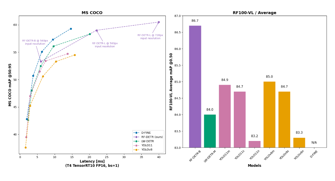 RF-DETR also achieves state-of-the-art performance on RF100-VL, a new object detection benchmark that measures model domain adaptability to real world problems. RF100-VL was designed by researchers from Roboflow and Carnegie Mellon University.