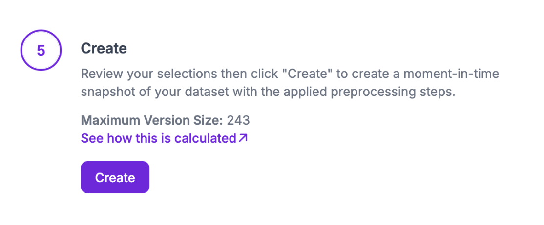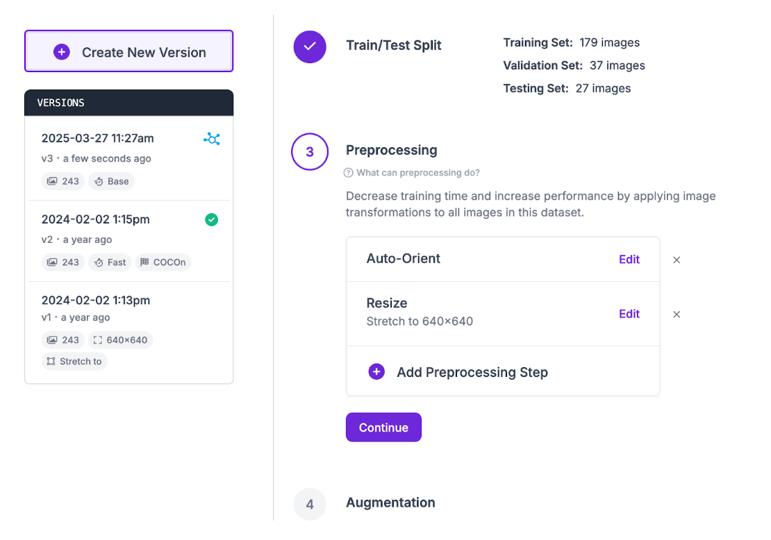 Once you have a dataset ready, click on the “Versions” tab in the left sidebar of your dataset dashboard. From this page, you can create a dataset version – a snapshot of your dataset that is frozen in time. You can use dataset versions to train models.