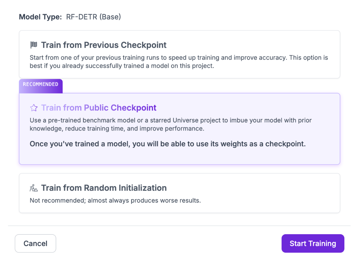 By training on our platform with Roboflow Train, you can leverage our custom-trained, optimised checkpoint for use in training. We have found this checkpoint leads to higher mAP scores when compared to the public RF-DETR COCO checkpoint.