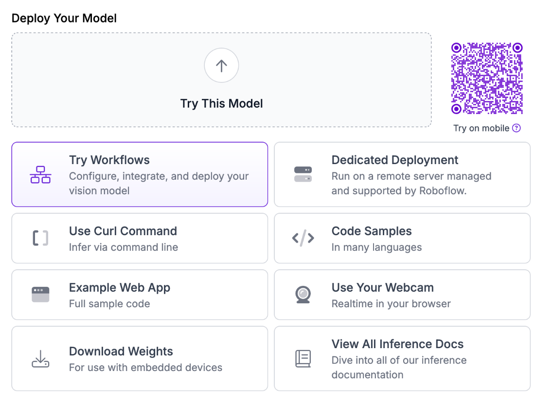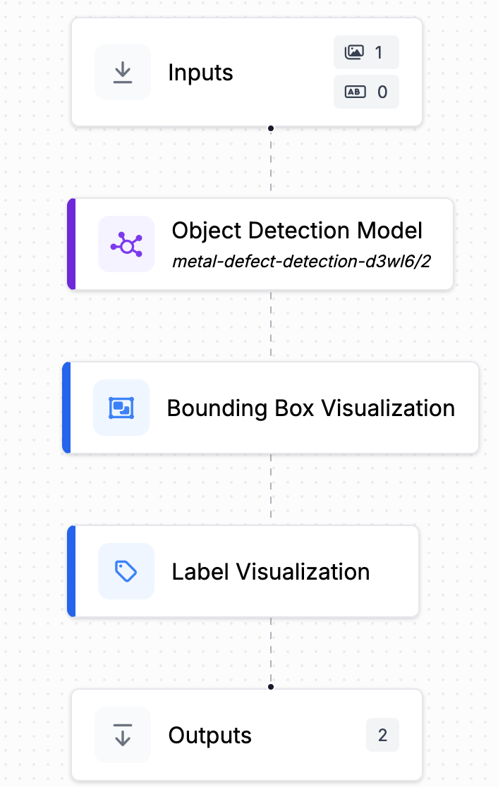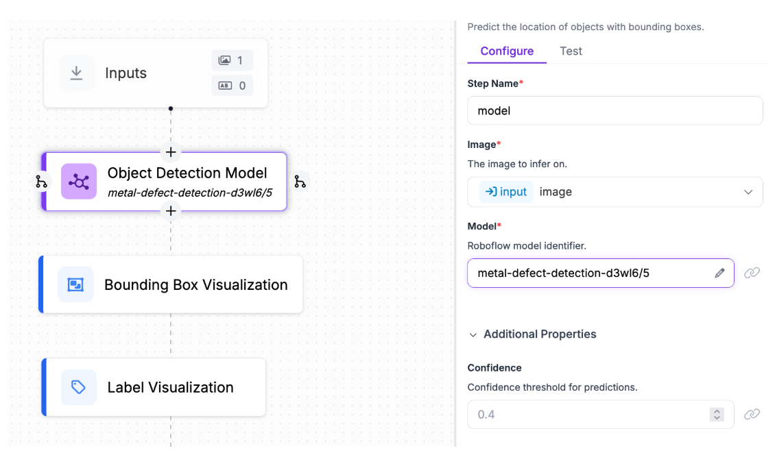 With a trained model, the next step is to deploy your model. RF-DETR is fully supported in both Roboflow Workflows and Roboflow Inference. Workflows is a web-based vision AI application builder with which you can build multi-step apps. Workflows has support for a range of vision tools, from running object detection models to tracking objects to smoothing predictions.