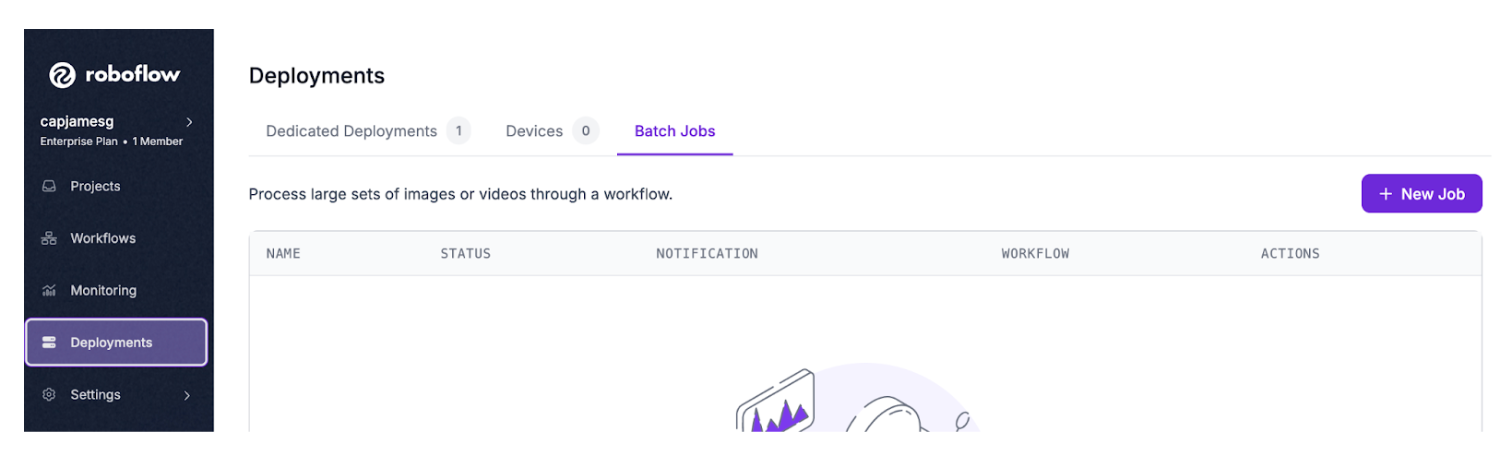 To run your Workflow on batches of images, go to your Roboflow dashboard, click Deployments in the sidebar, then select “Batch Jobs”: