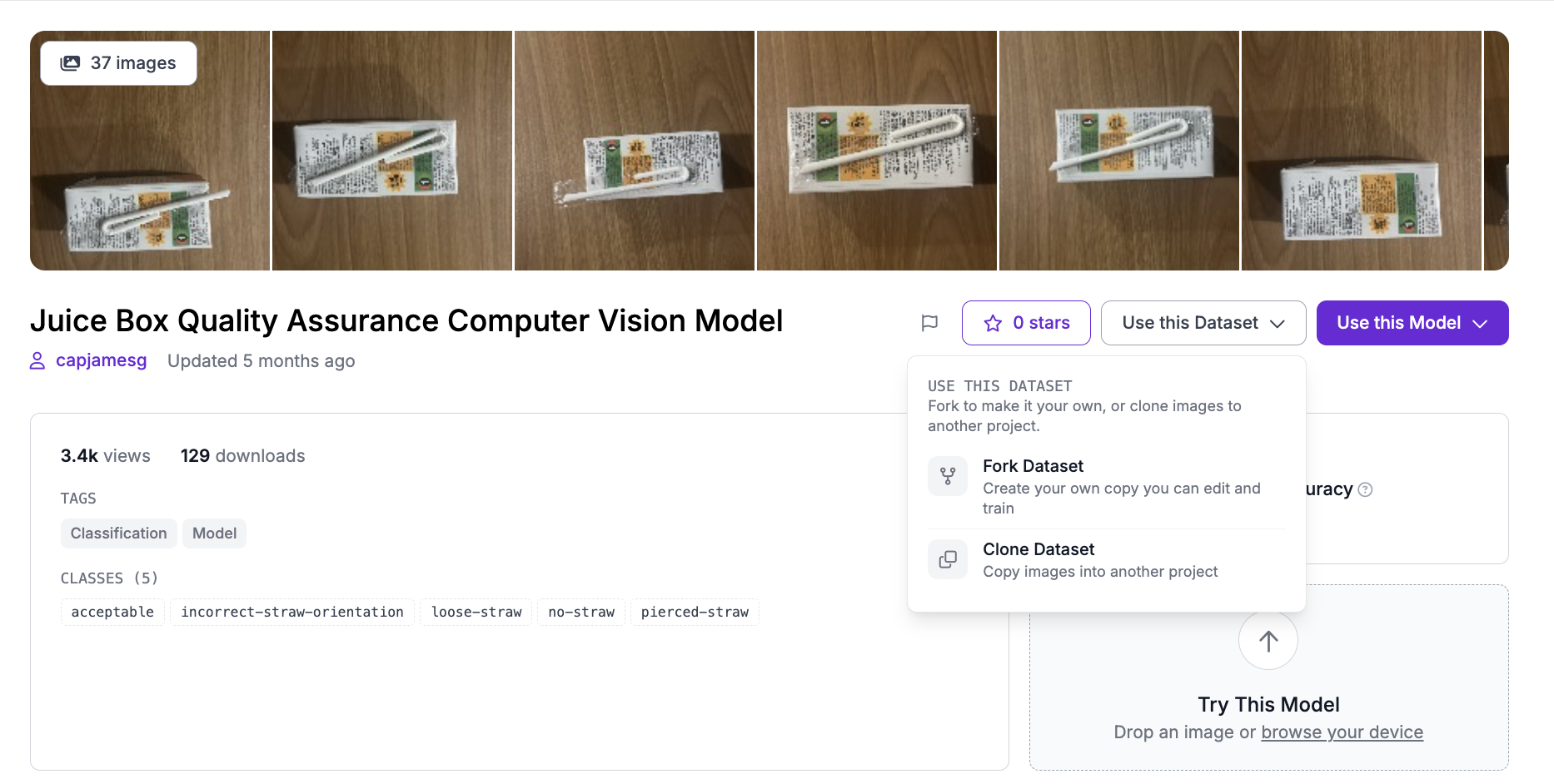 To use the juice box dataset, navigate to the dataset in Universe, then click “Fork to Roboflow”.