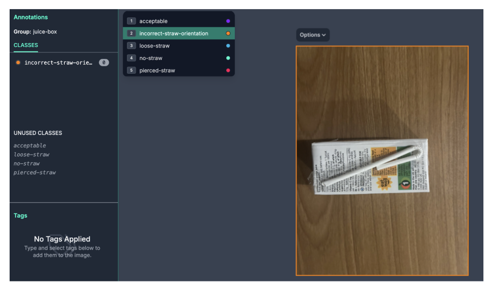 When you get started, you will need to create the class labels for use in training your model. For this guide, we will have five labels. Four of the labels indicate defects, and the other says that the juice box in frame is acceptable. Our labels are: