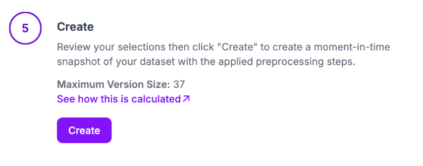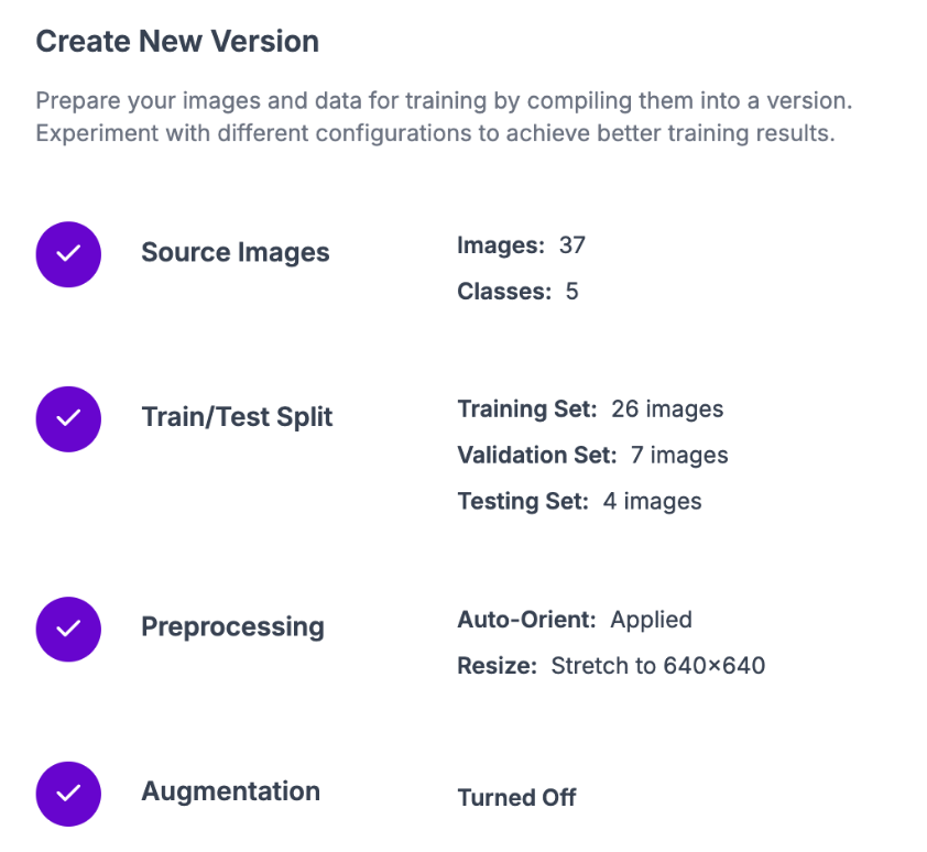 Once you have labeled your dataset, you are ready to generate a dataset version. A version is a snapshot of your dataset frozen in time. You can use dataset versions to train models