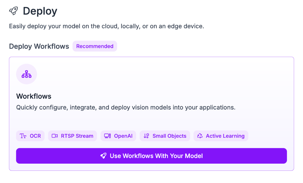 If you are interested in learning more about deploying with Roboflow, refer to the Inference documentation. We encourage you to explore Workflows, too - experiment with different blocks in the web editor and see what you can build!