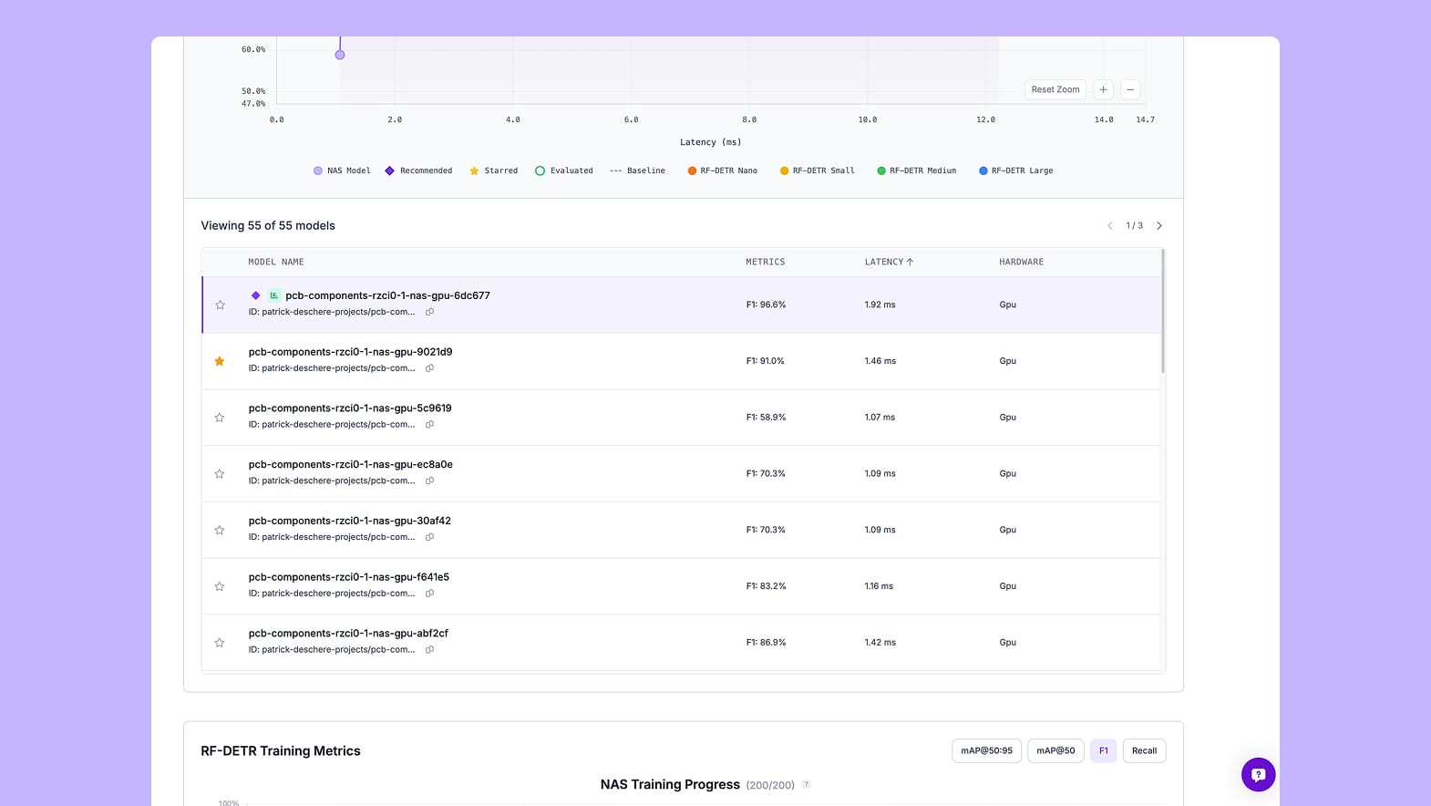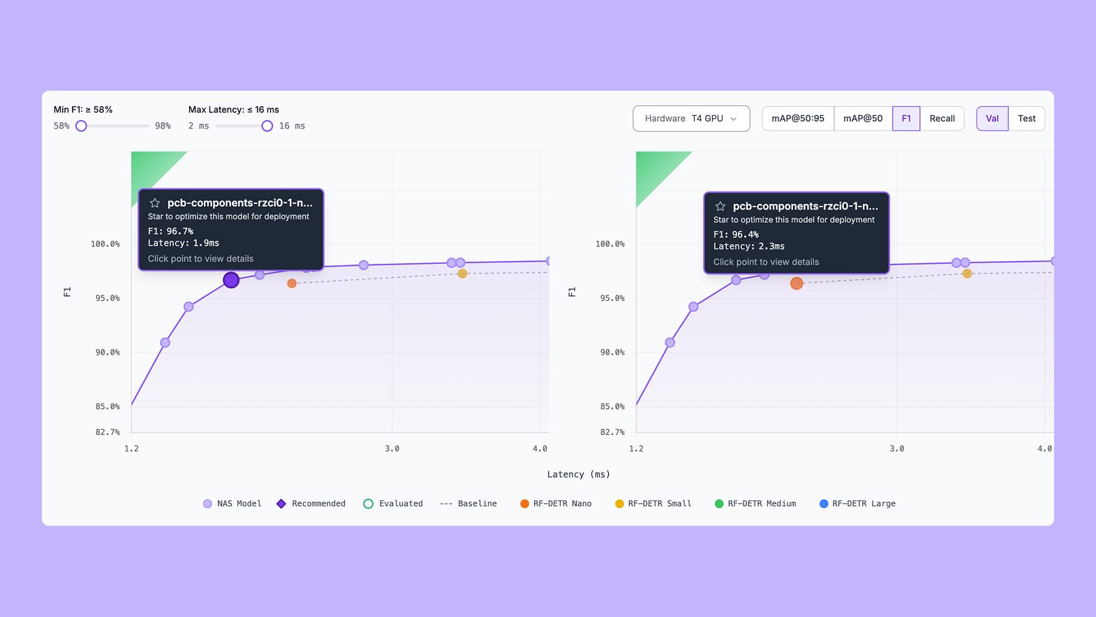 In the Model Explorer chart, the purple dots represent the NAS-generated models. Notice how several of them push further up and to the left (indicating higher accuracy and lower latency) than the baseline RF-DETR Nano model (the orange dot) trained on the exact same data. For example, one NAS-discovered model achieves a 96.7% F1 score with a latency of just 1.9ms, beating the baseline Nano model's 96.4% F1 score and 2.3ms latency.