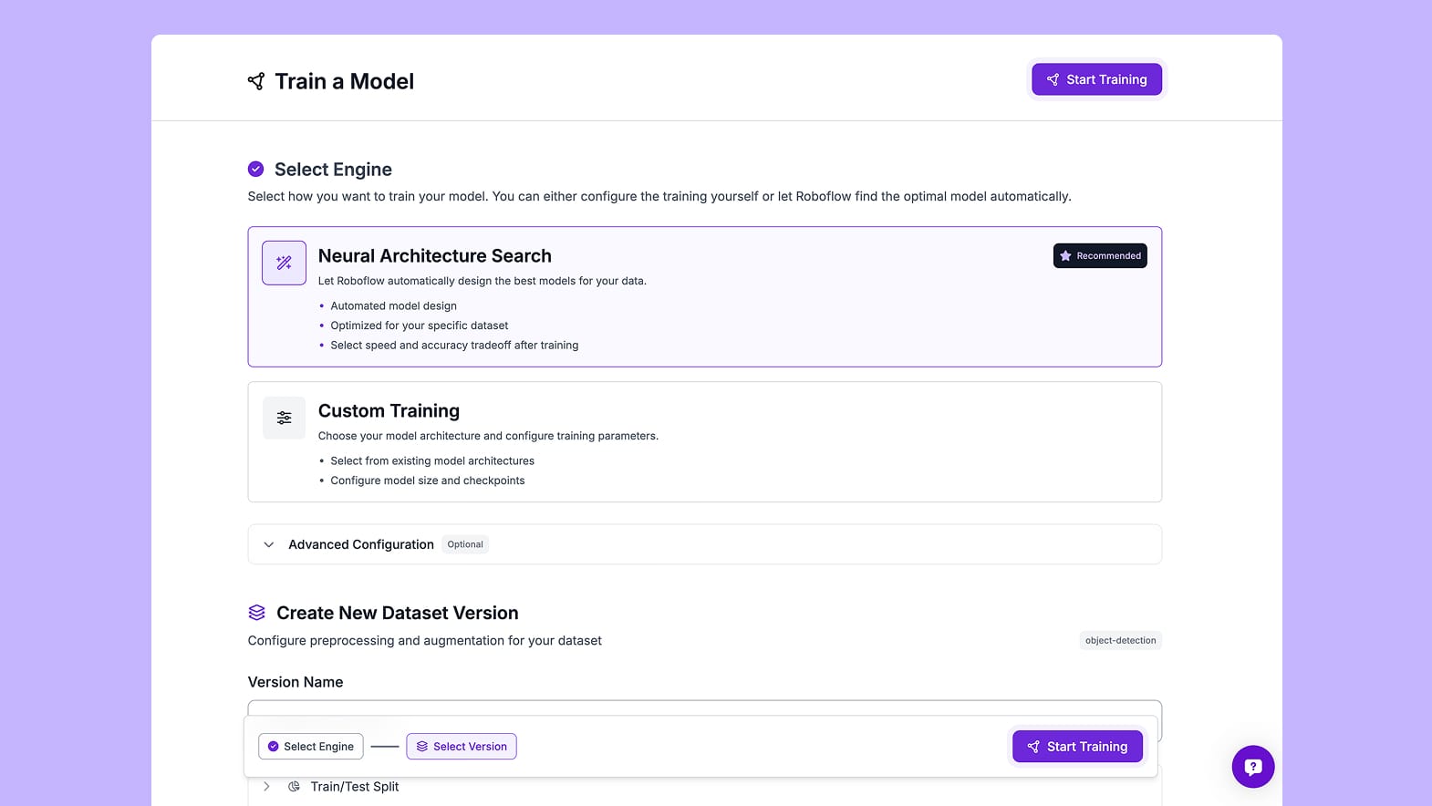 1. Log into Roboflow and find an object detection or instance segmentation project. On the Train tab, select Neural Architecture Search as your training engine. Adjust other settings depending on your needs and click Start Training.