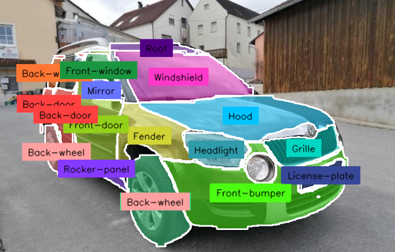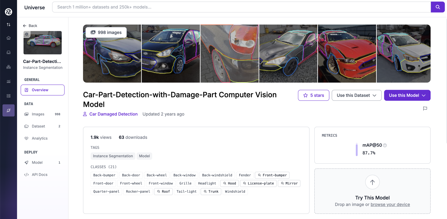 For this tutorial, we'll use the specialized Car Part Detection dataset from Roboflow Universe. Unlike detection datasets, this version contains polygon annotations that wrap around the contours of different car parts like hood, wheel, bumper, windshield, etc.