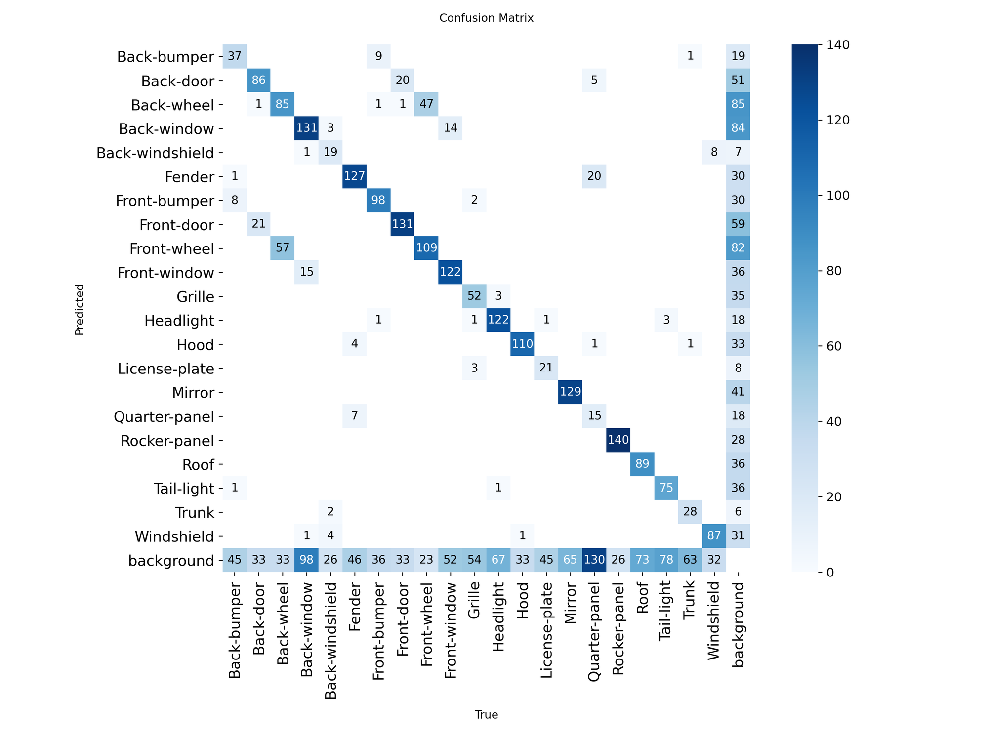 - Background leakage: A large amount of true objects (like 130 quarter-panel, or 98 back-window) are being ignored by the model and labeled as "background".