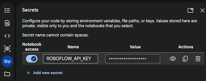 To integrate this data, store your Roboflow API Key in your Colab 🔑 Secrets under the name ROBOFLOW_API_KEY. This ensures your credentials remain secure during the training process.
