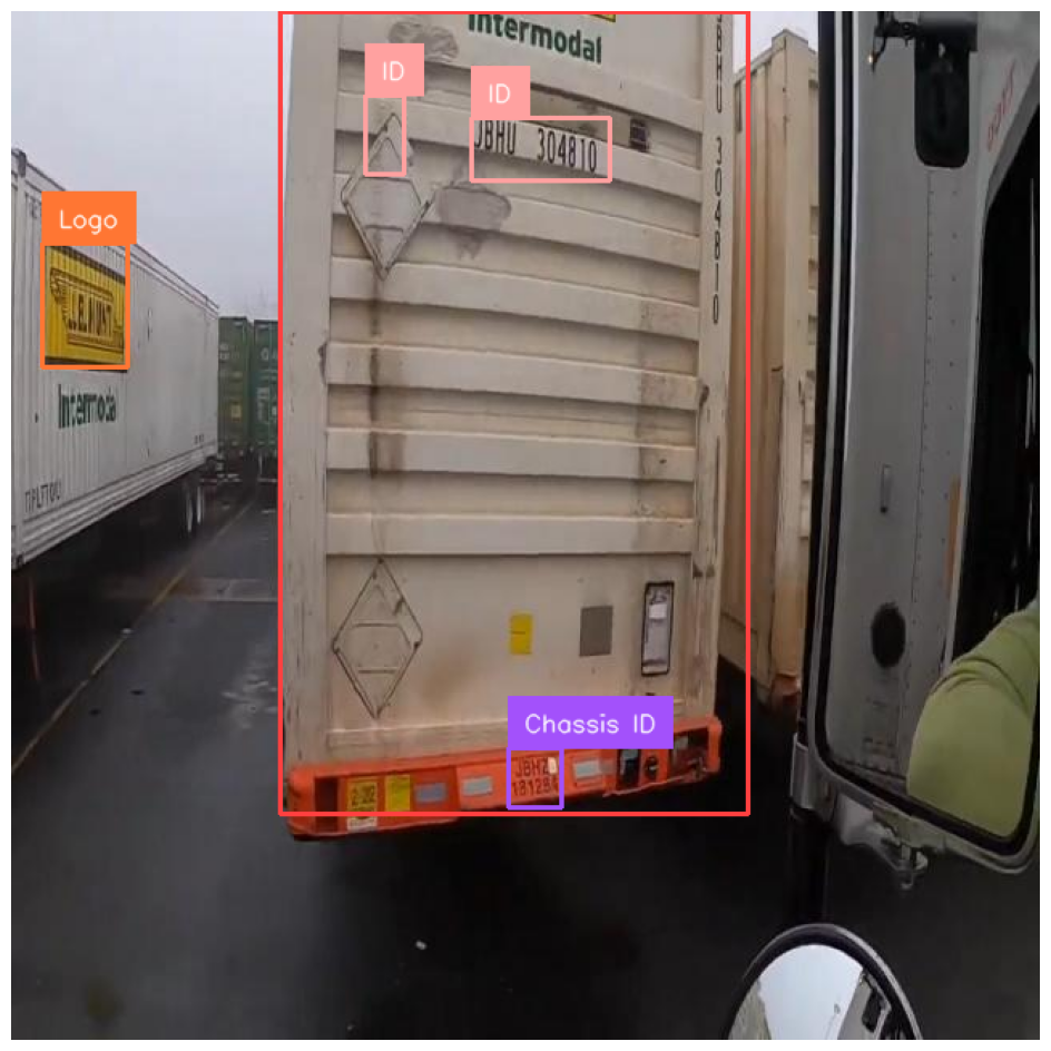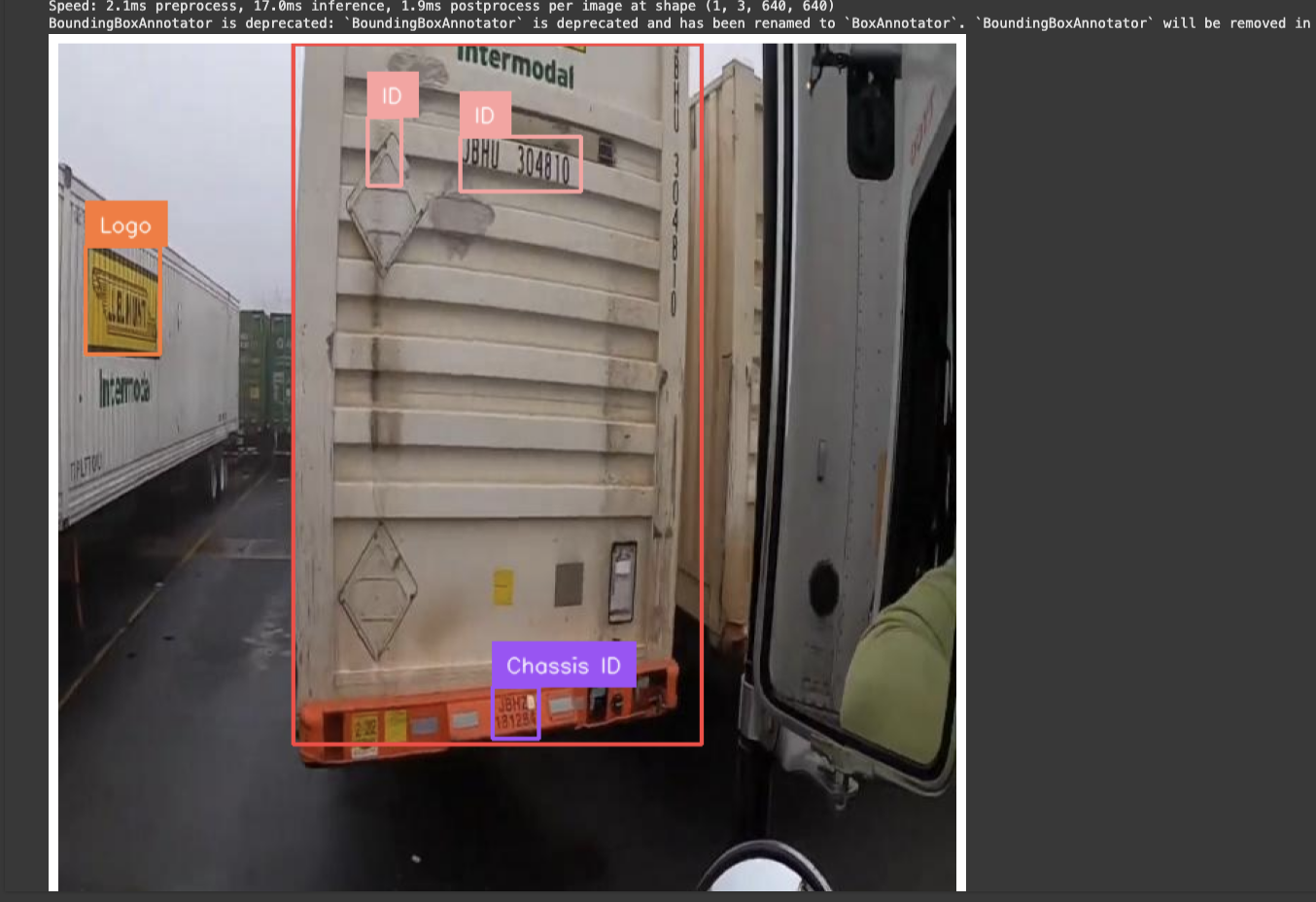 Our model successfully identifies the container, the container ID, the container logo, and the chassis ID, four classes in our dataset and present in the image above.
