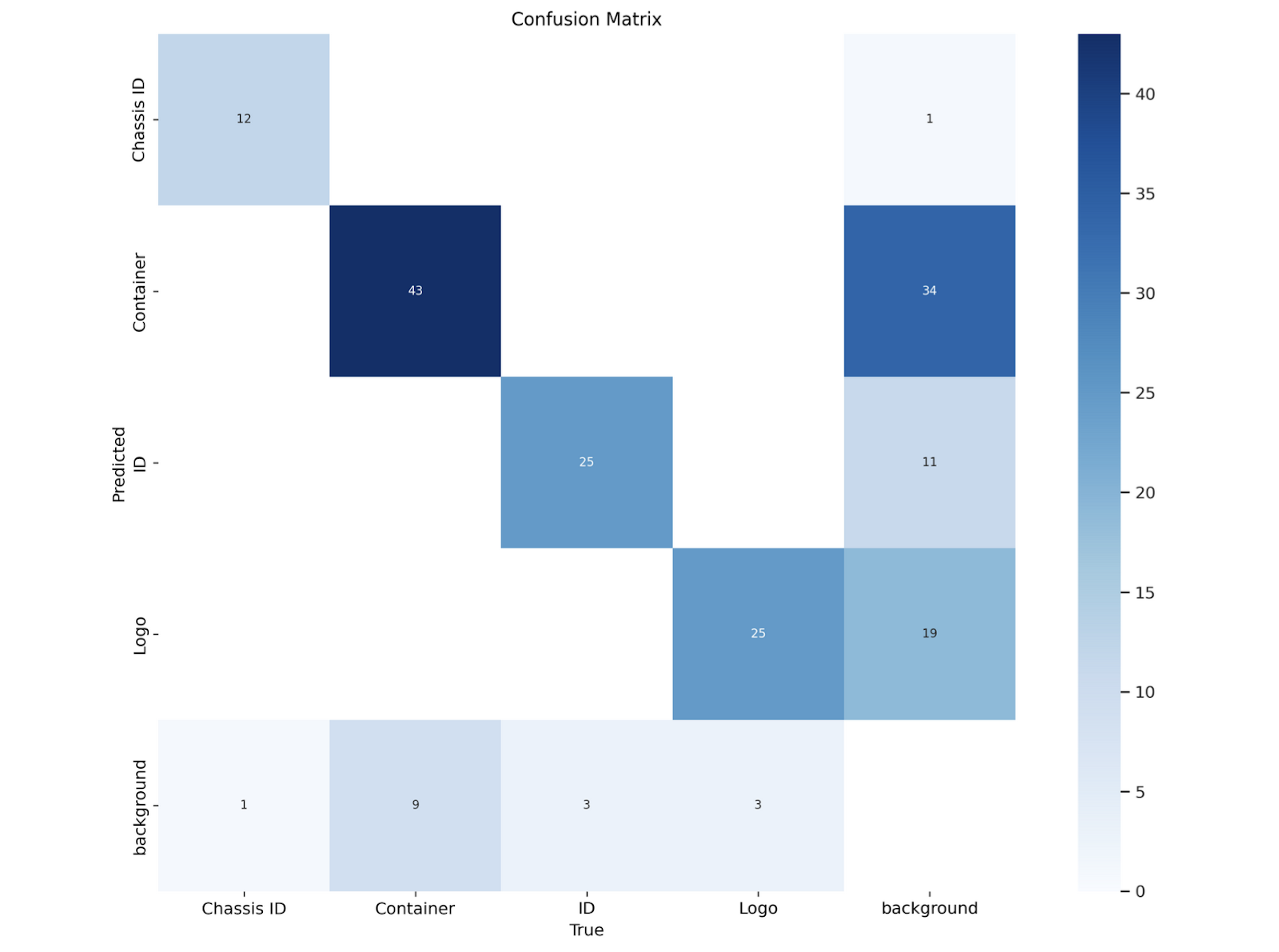 Here is the confusion matrix after training a model for 250 epochs on the shipping container dataset: