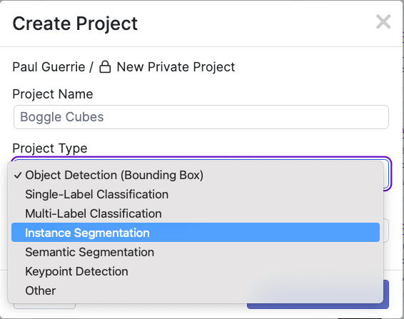 Create a new Project in Roboflow and select Instance Segmentation.