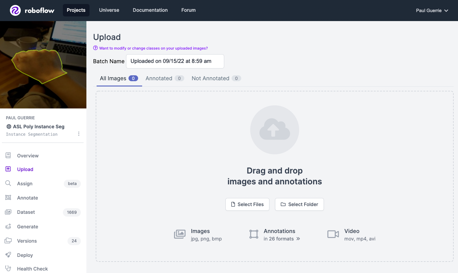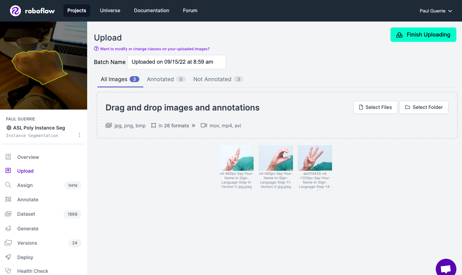 To get started, create a free Roboflow account. We will be using this American Sign Language dataset from Roboflow Universe as our example dataset. An American Sign Language (ASL) model could be used to automatically interpret ASL.
