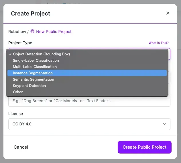 Create a new project in the Roboflow dashboard and select Instance Segmentation as the Project Type.