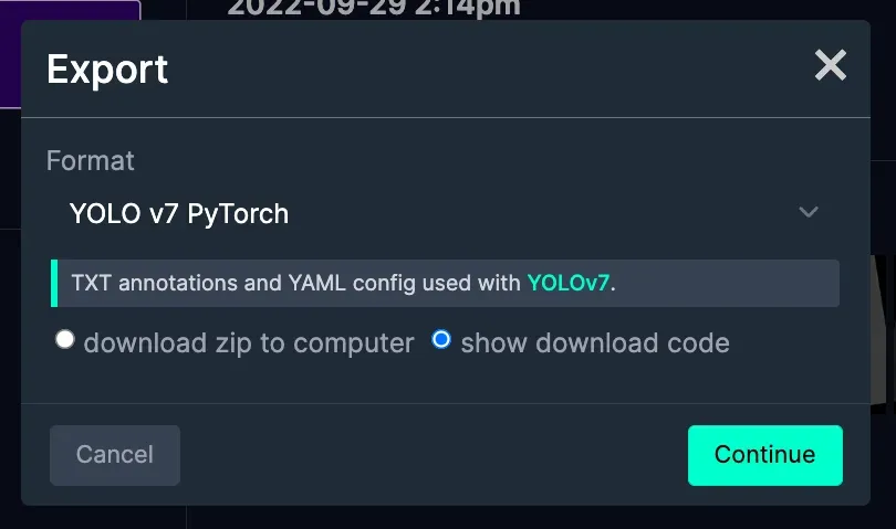 One of the most convenient ways to download your dataset from Roboflow Universe is to use our pip package. You can generate the appropriate code snippet directly in our UI. On your dataset's Universe home page, click Download this Dataset button and then select YOLO v7 PyTorch export format.