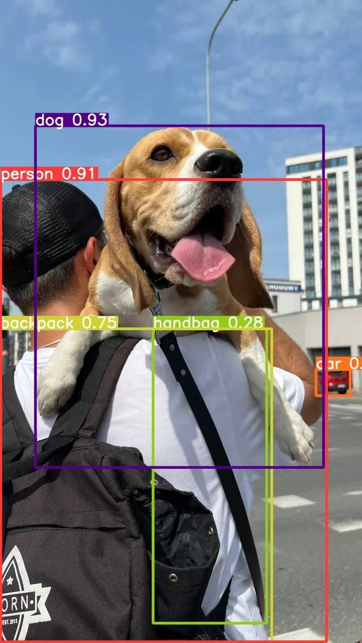 Our model was able to successfully identify a person, dog, and car in the image. With that said, the model misidentified a strap as a handbag and failed to detect the backpack.