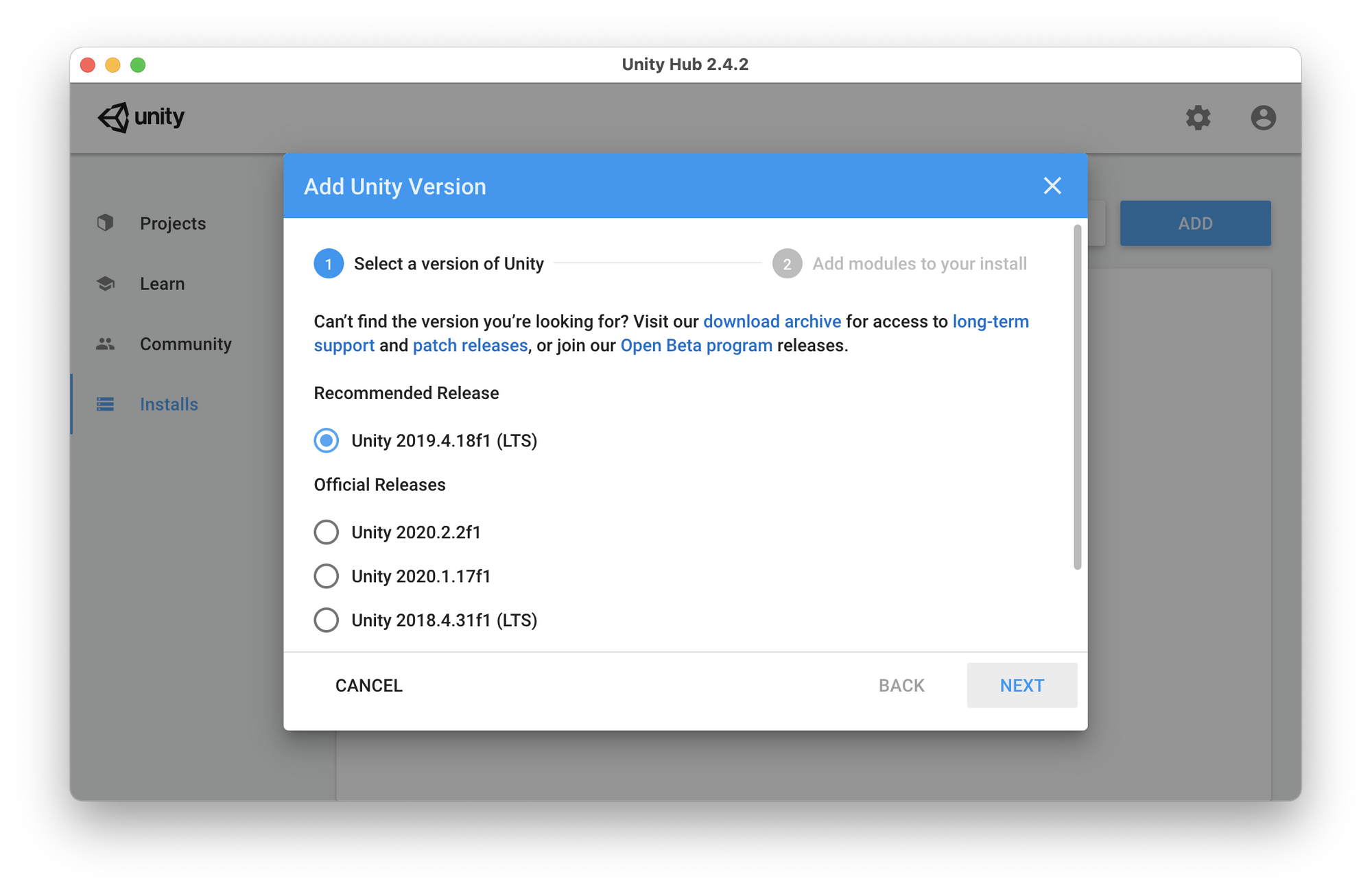 Once you have Unity Hub installed and activated, click "Installs" on the left and follow the process to install Unity 2019.4.18f1 (LTS) – this is the current "Long Term Support" version of Unity and is known to work with Perception and the rest of this tutorial.