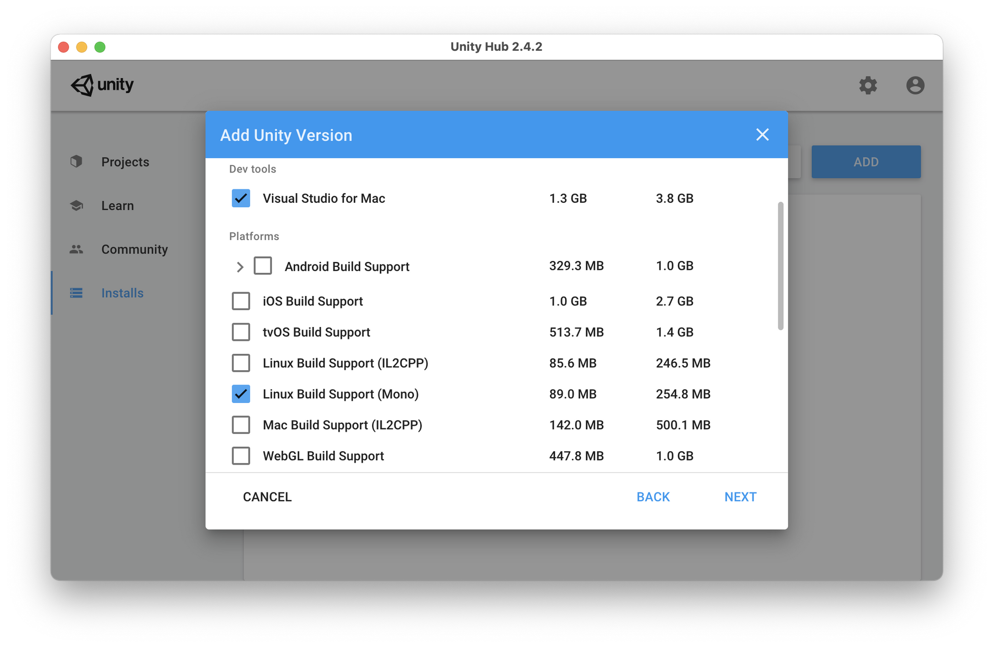 In the installation options, be sure to select Visual Studio and Linux Build Support (Mono) which we will need later.