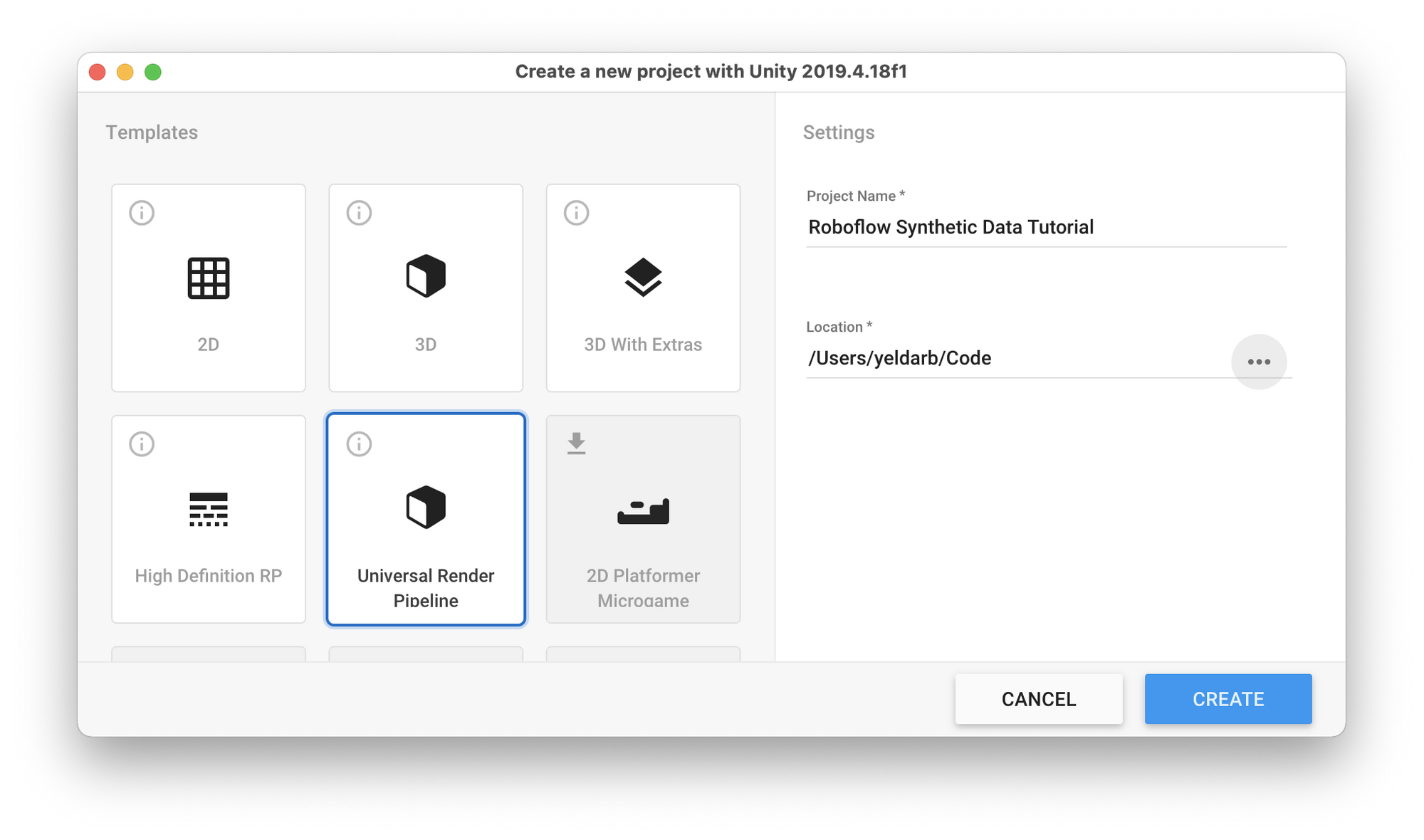 After you've accepted the license, Unity will take a few minutes to download and install. Once it's done, open your new Unity installation and create a new project starting from the Universal Render Pipeline template. You can call your project Roboflow Synthetic Data Tutorial and choose a location on your hard drive to store the project.