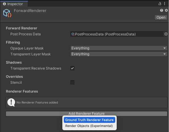 Use the search bar on this Project pane to find the ForwardRenderer then click Add Renderer Feature -> Ground Truth Renderer Feature to process the assets for use as synthetic data objects.