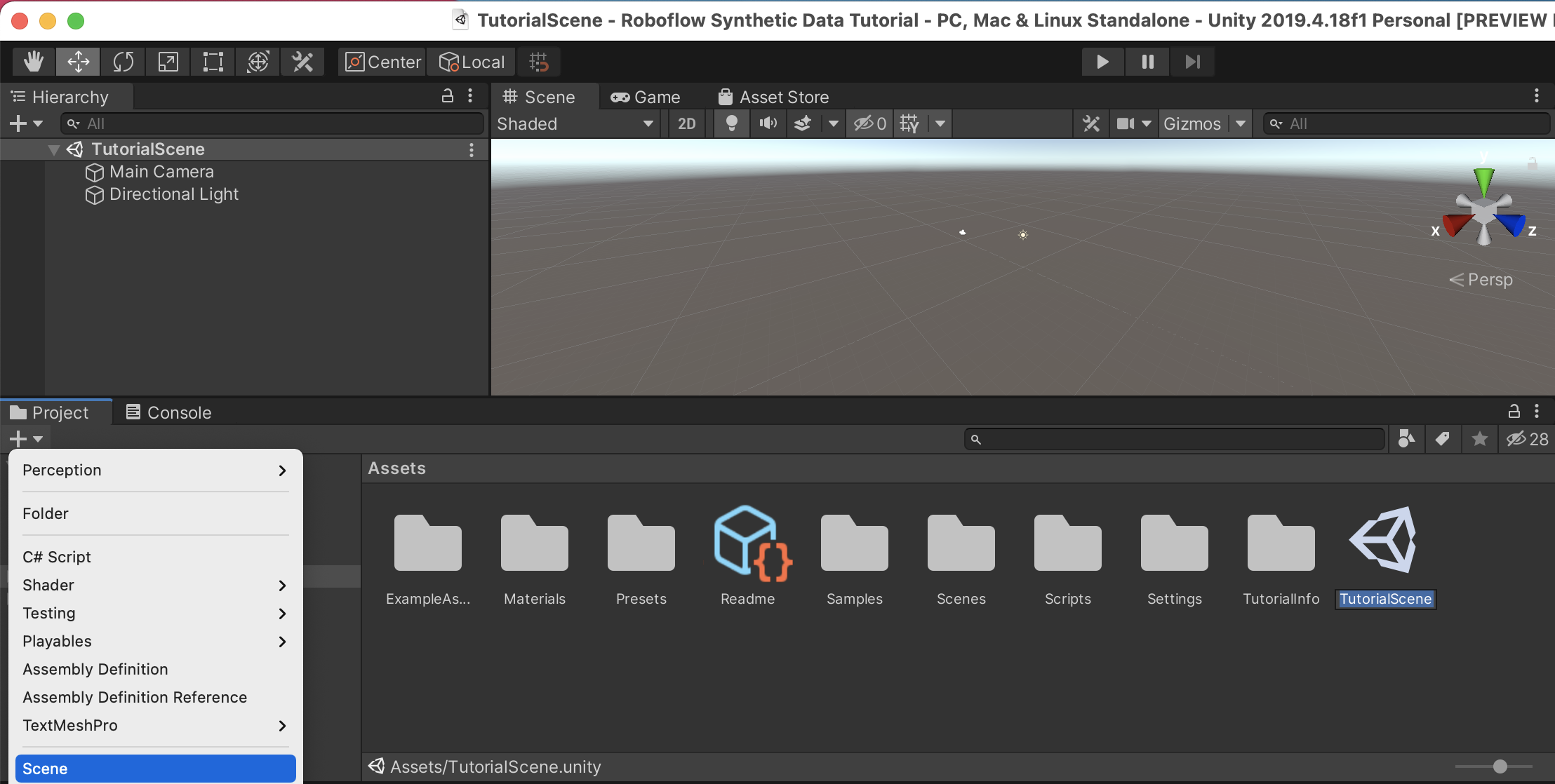 We've now performed all the setup to use this project to generate synthetic 3D training data for our object detection model. Now let's create a scene to contain our assets. Click the + in the Project window and select Scene then name it TutorialScene. Double click the newly created scene to focus it in your Hierarchy.