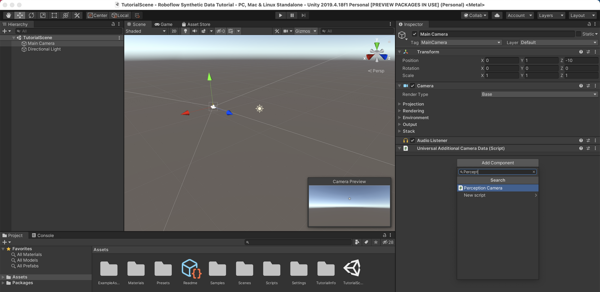 Next we need to setup our scene's Main Camera with some extra functionality so it can work with our Perception package. To do this, click on Main Camera from the Hierarchy to focus it in the Inspector. Click Add Component and find Perception Camera in the dropdown list.