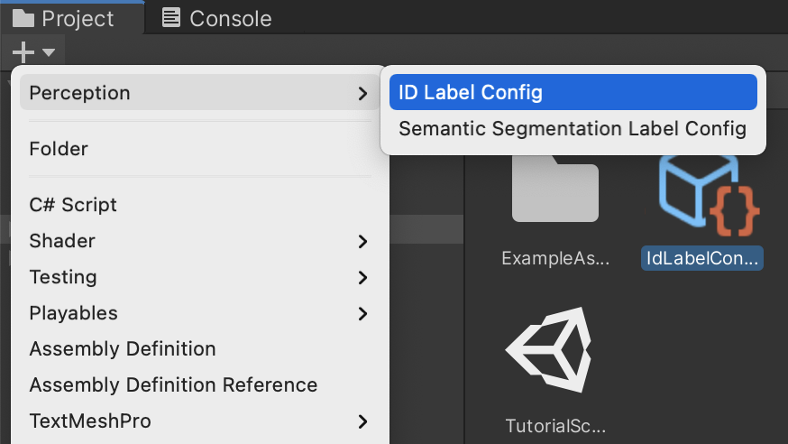 Next we will configure what labels we'd like our simulation to output. In the Project tab, click the + and navigate to Perception > ID Label Config.